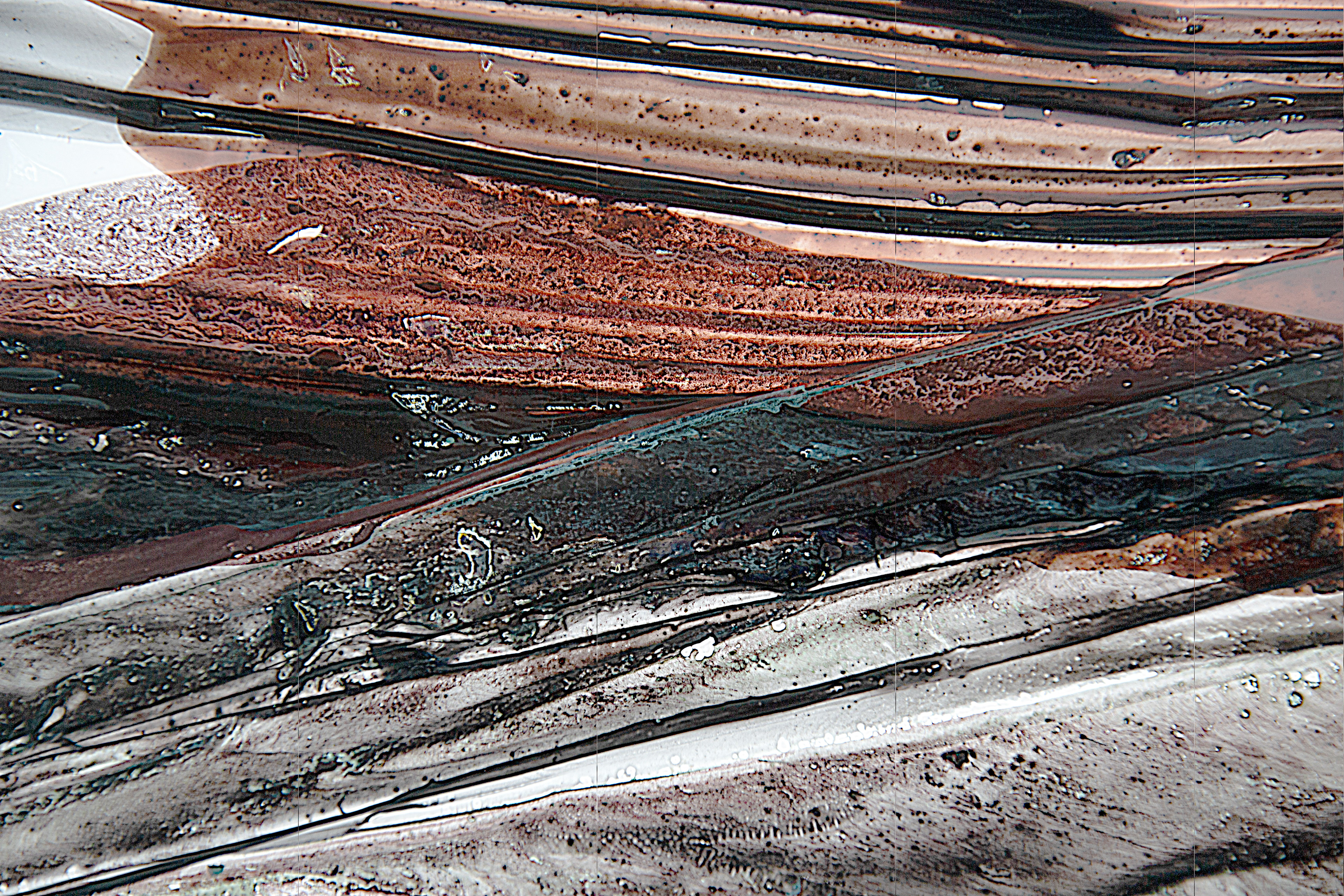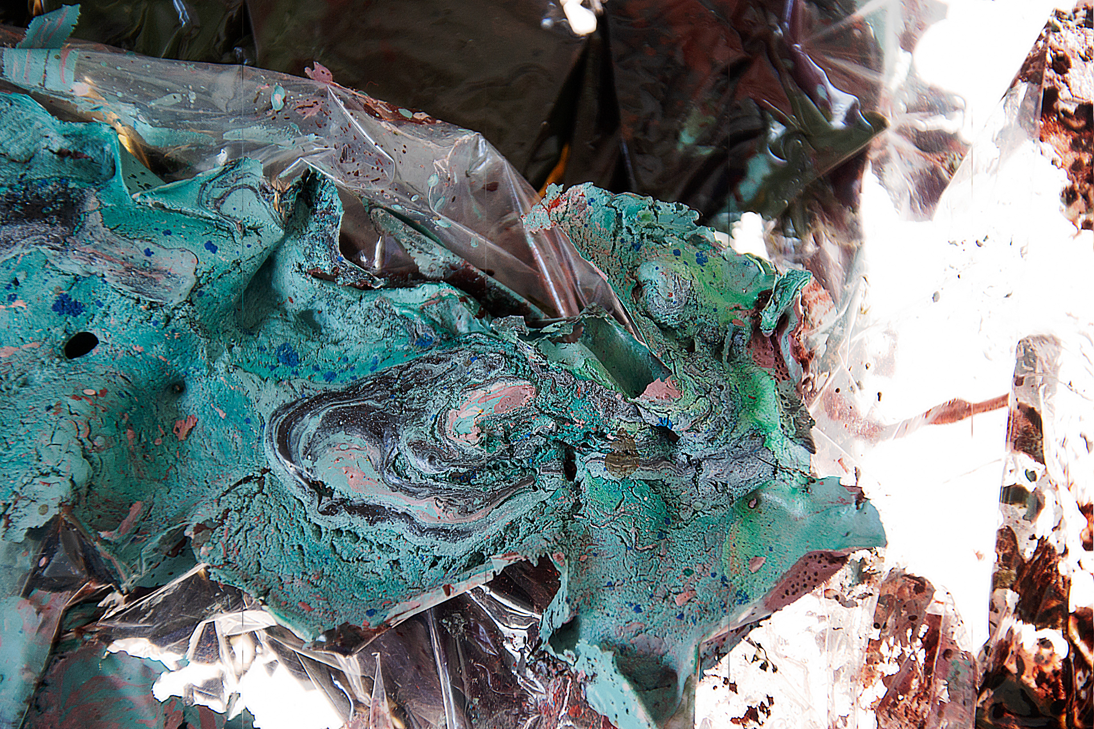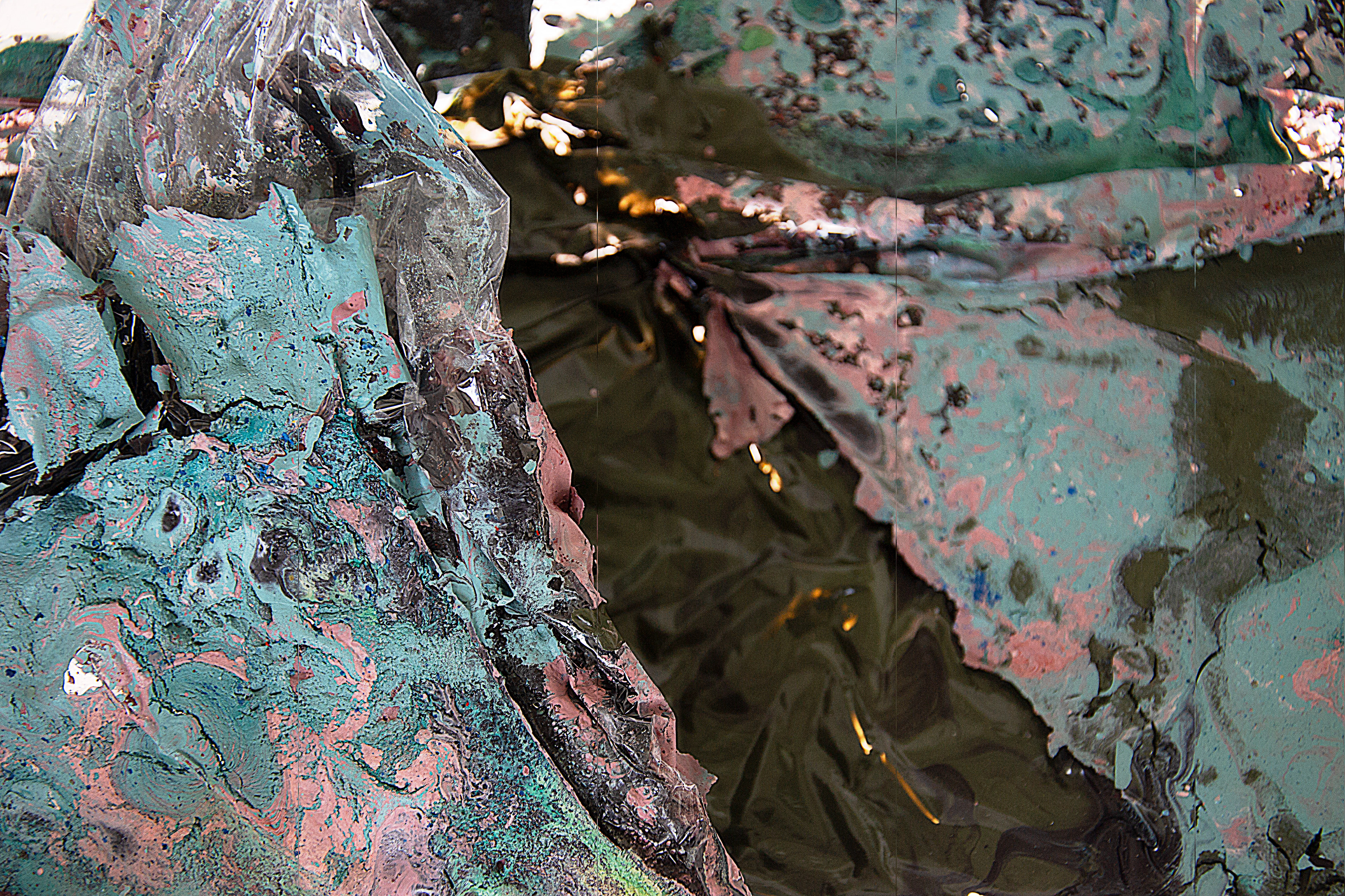 Stillhet som efterblivet stormar, regn och allt de som format detta färglandskap. När de droppat och runnit likt väderleken bildar de mönster som vi känner igen från naturen. Att något gjort av plast och färg kan likna något så organisk är förunderligt.