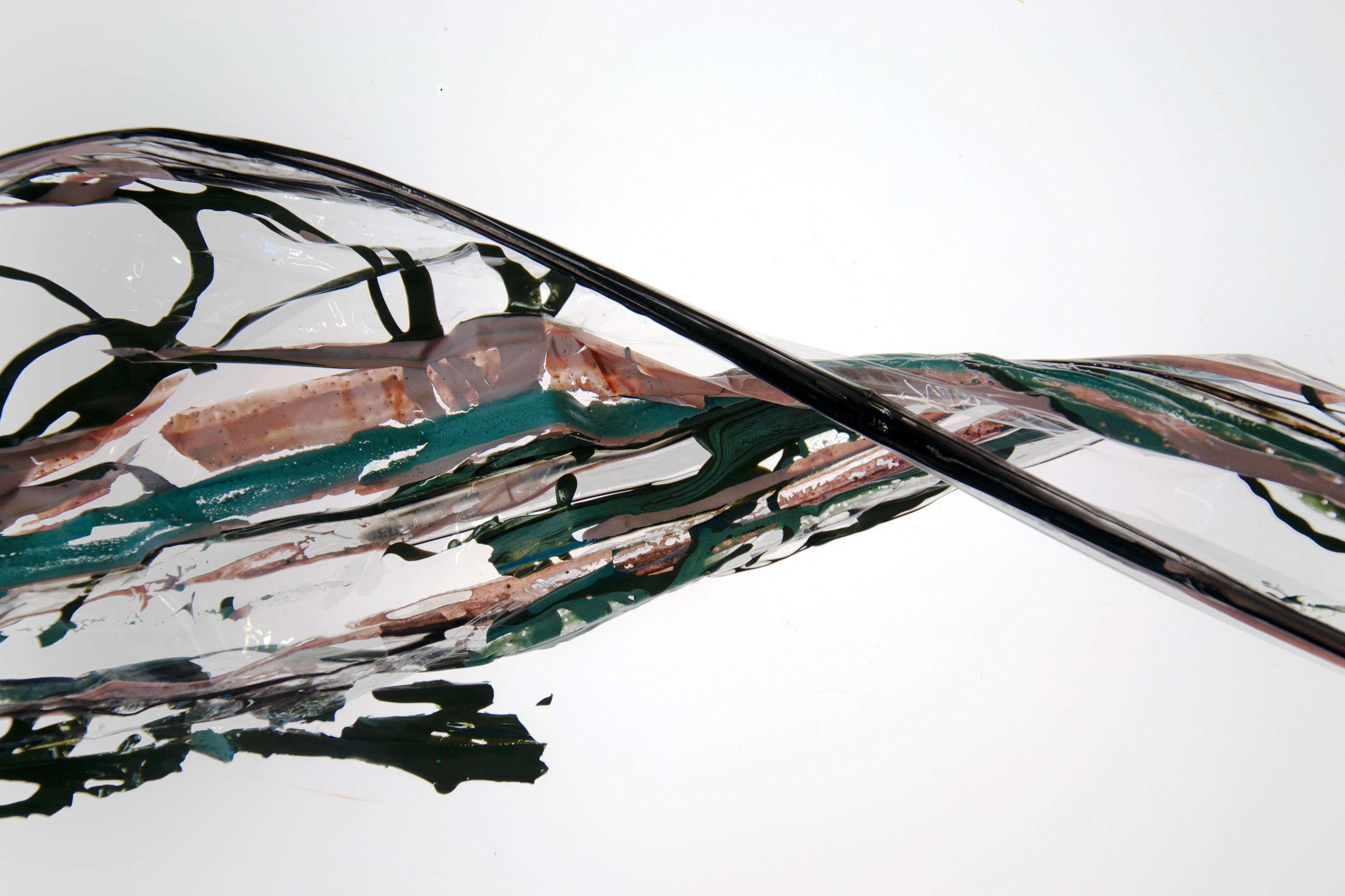 Som i många av mina konstverk utforskar detta material och färg, hur interagerar plasten med väggarna, tejpen och färgen. Plasten har dragit ihop sig på ställen där färgen har dragit ihop sig, tejpen har släppt när färgen varit för tung eller blöt. På detta tredimensionella kanvas har jag målat med gravitation istället för med pensel och skapat detta färg landskapet. Färgen har runnit, droppat, fallit, lämnat spår på vägen till den slutgiltiga stillhet som nu efterblivet. Rörelse över tid i ett verk en process frusen för alltid på transparent plast utanför ramen.