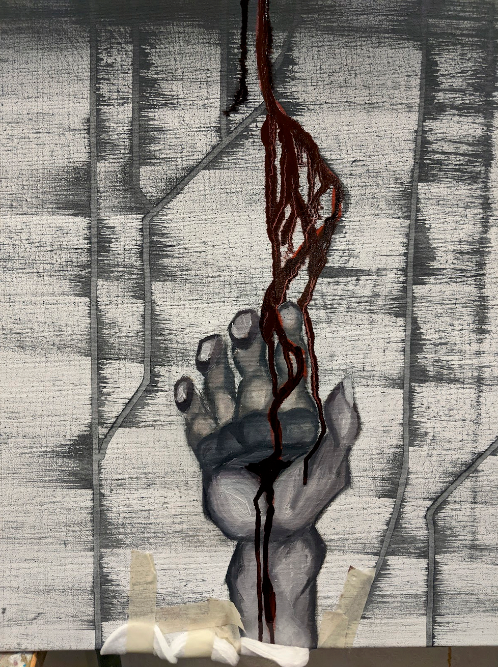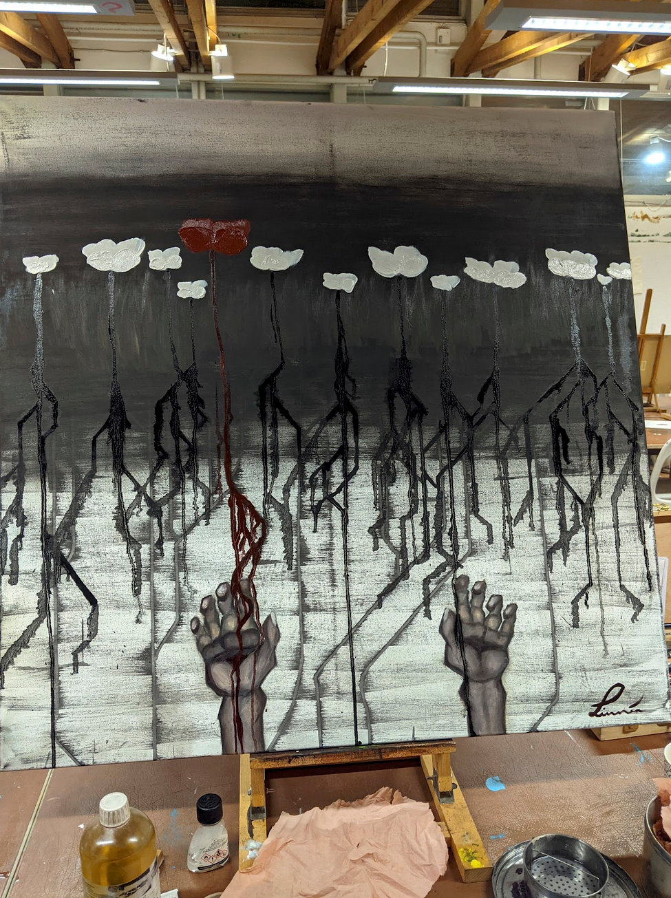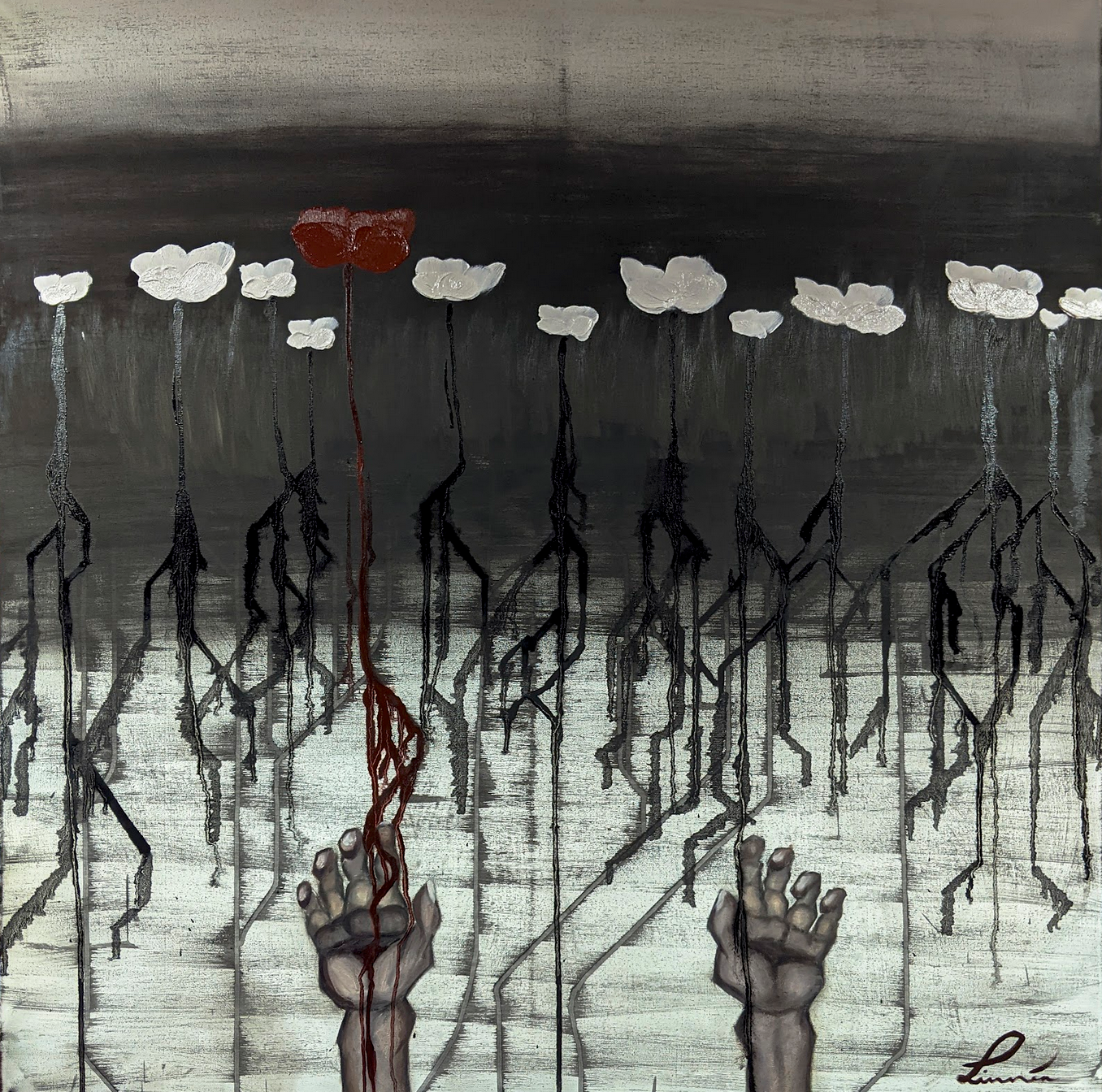 uppskurna handlederna sugs upp genom rötterna och färgar blomman röd.